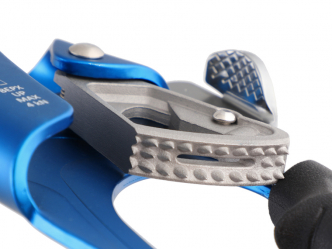 Кулачок с зубьями конической формы выполнен из легированной стали. Имеется канавка для удаления грязи и льда, что обеспечивает надежную фиксацию на мокрой или замерзшей веревке. Защелка кулачка снабжена насечками для комфортной работы в перчатках.