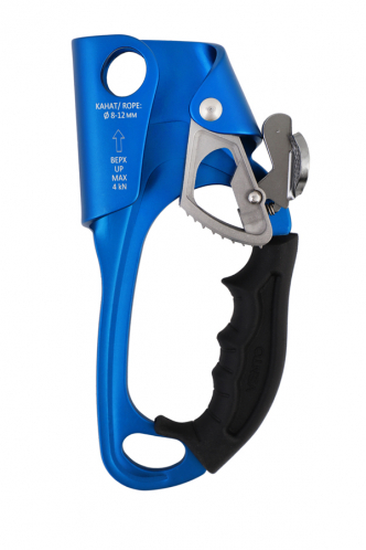 Зажим под правую руку предназначен для подъема по вертикальным или наклонным перилам, а также применяется при проведении спасательных работ. Соответствует EN 567 и ГОСТ EN 12841-2014 для использования в системах канатного доступа. Жумар совместим со статическими (ГОСТ EN 1891-2014) и динамическими (EN 892) веревками.