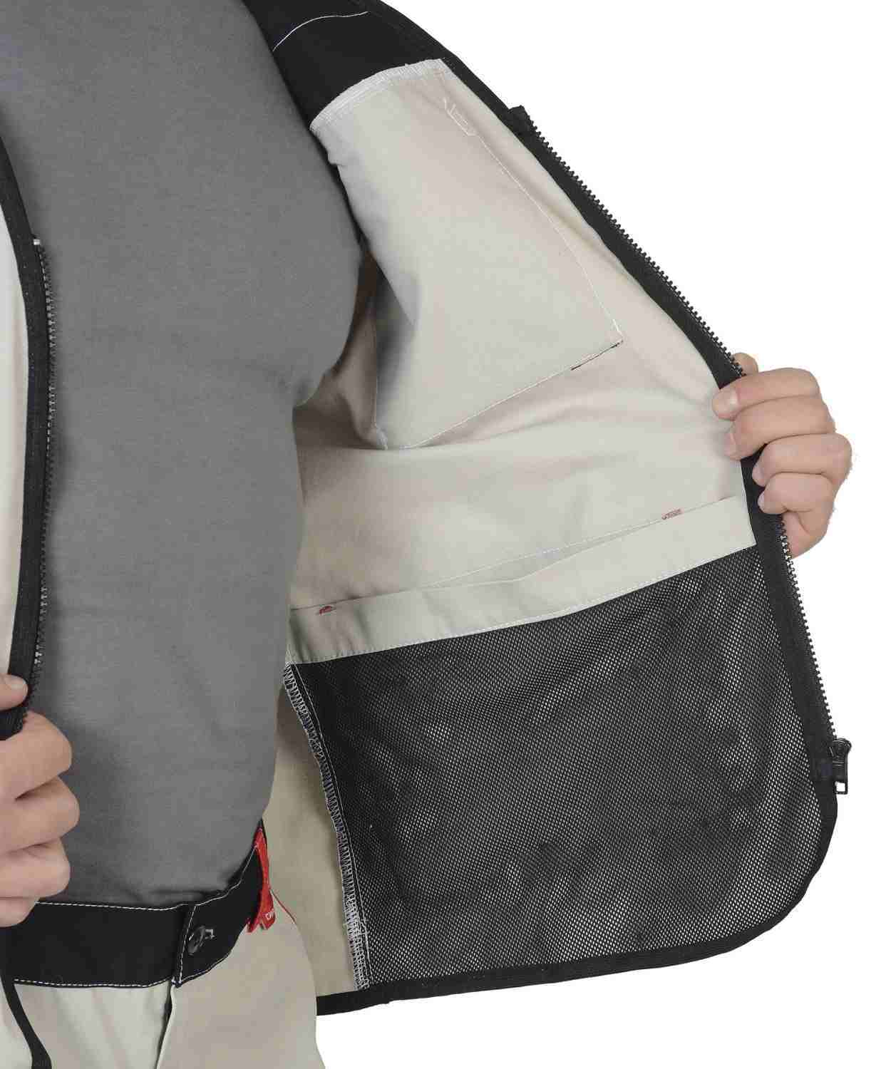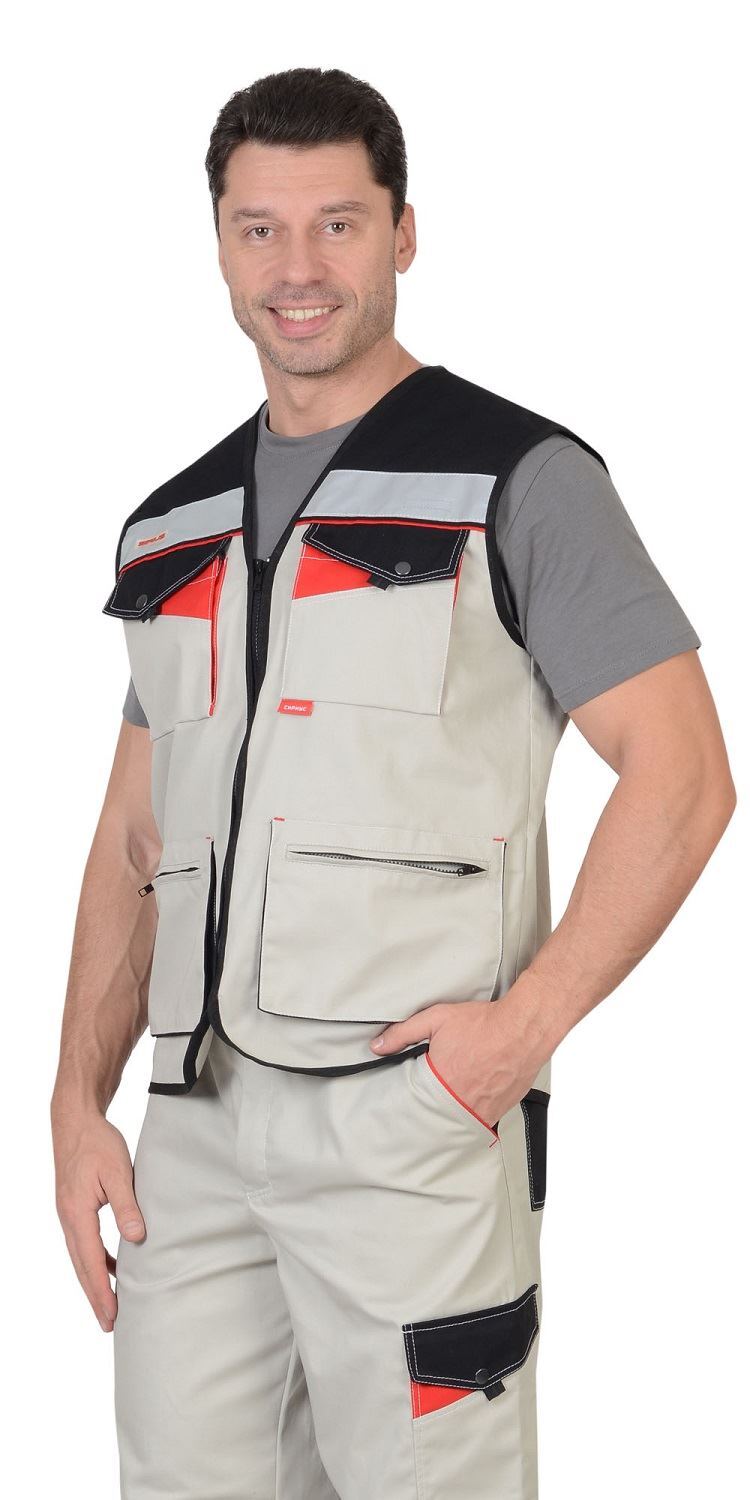 Жилет с центральной застёжкой на "молнию", с V- образным вырезом горловины, с отрезными цветными кокетками, с накладными верхними карманами с объёмом по бокам и фигурными клапанами , с нижними накладными объёмными карманами на "молнии", с внутренним карманом из сетки застегивающийся на липучку. В жилете по пройме и по всему контуру используется тесьма окантовочная. В жилете предусмотрена СОП шириной 50 мм для обозначения сигнальной видимости.