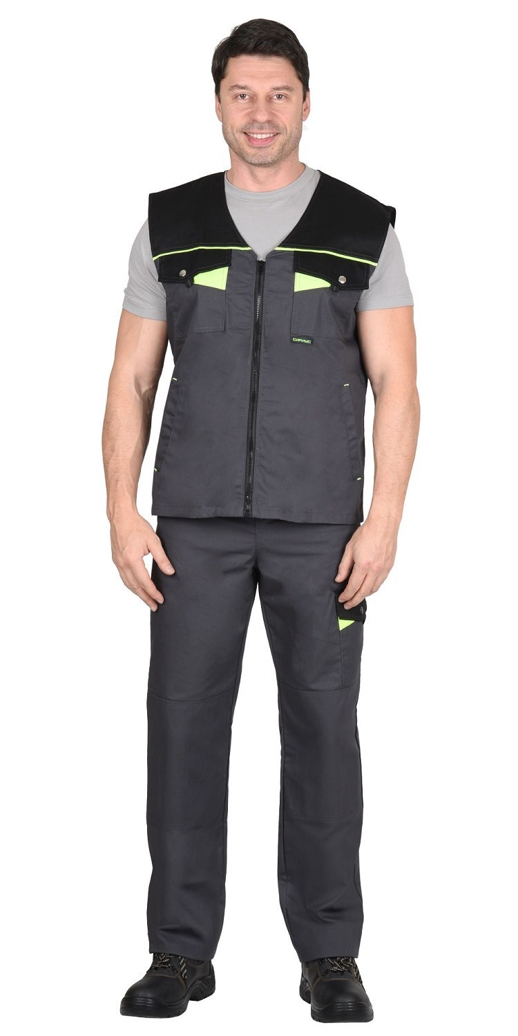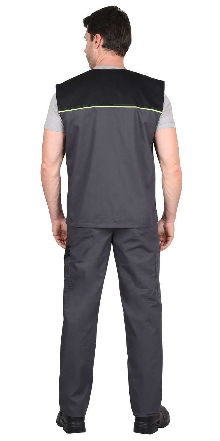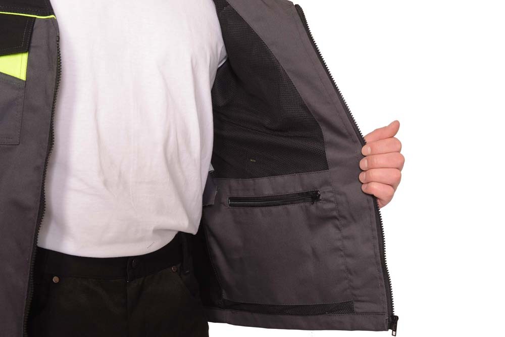 Жилет с подкладкой из сетки, на сетке выполнен карман на «молнии», с центральной застёжкой на тесьму - молния, с V- образным вырезом горловины, с отрезными цветными кокетками, с накладными верхними карманами и фигурными клапанами застегивающиеся на кнопку, с нижними прорезными карманами в «листочку».