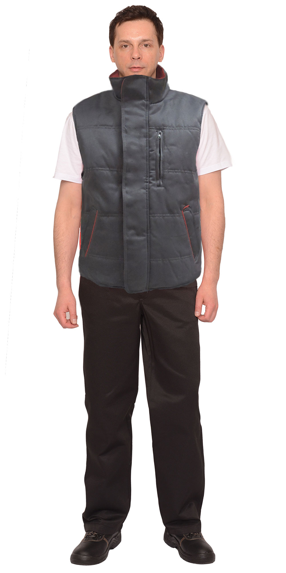 Описание: Жилет прямого силуэта утепленный с застежкой на молнию, с планкой. Воротник – стойка. Полочки с двумя нижними прорезными карманами. Внутренний накладной карман. Спинка удлинена.