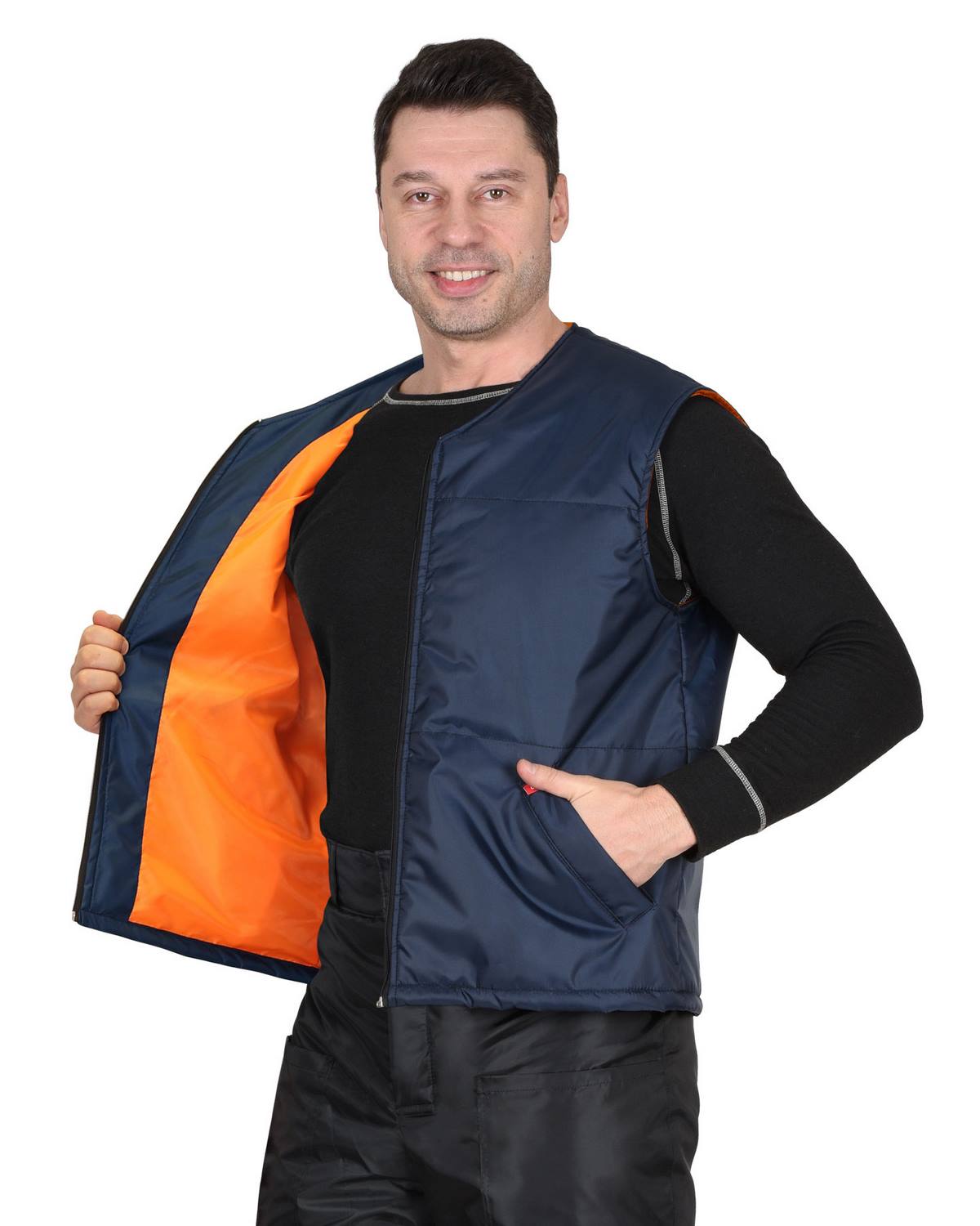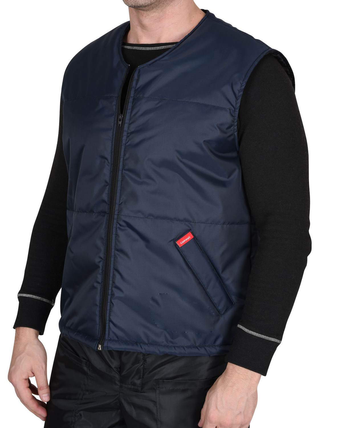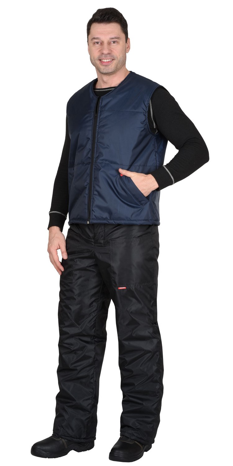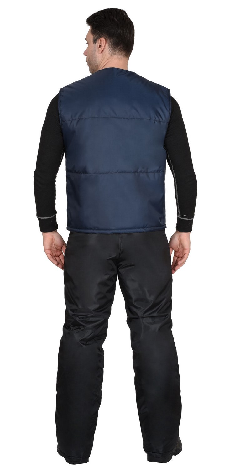 Жилет с горизонтальными строчками стежки полочек и спинки. V-образным вырезом горловины, с центральной застежкой-молнией, наклонными боковыми прорезными карманами с "листочкой"
