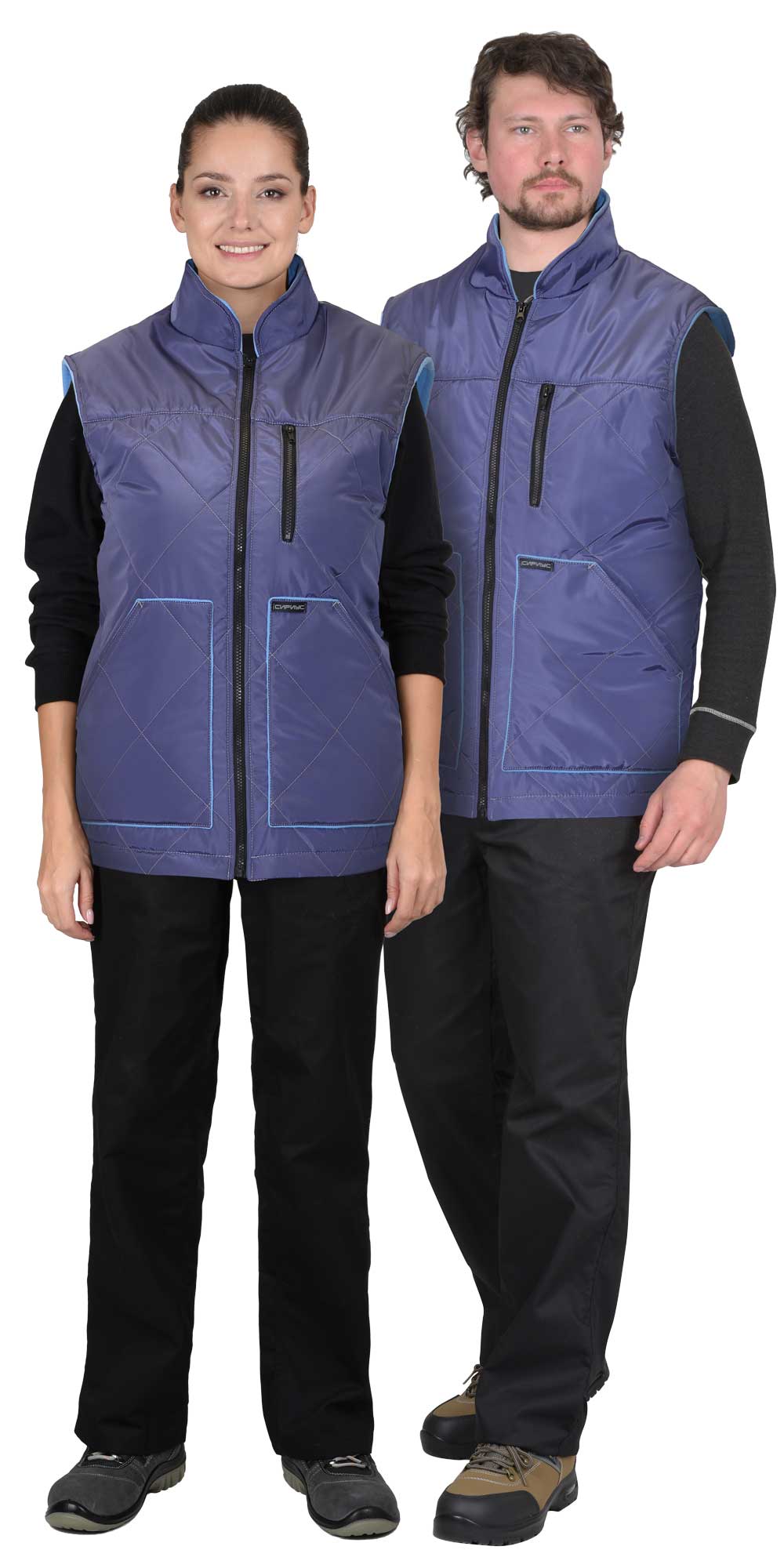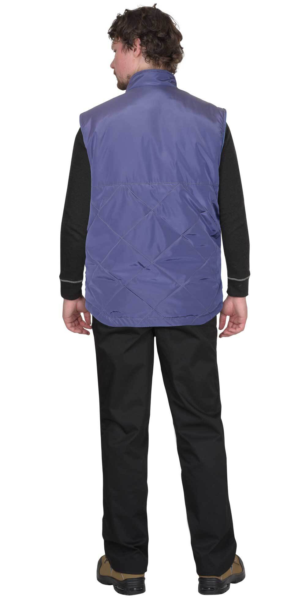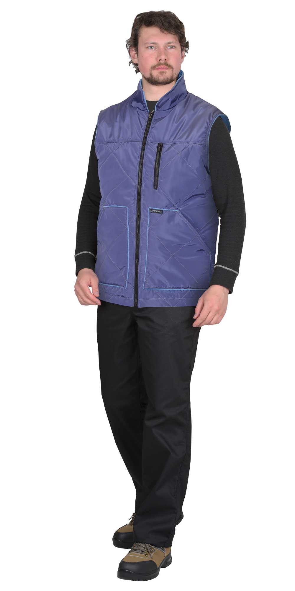 Жилет утеплённый, выстеган с утеплителем в виде ромбов, прямого силуэта, с застёжкой на молнию, с воротником стойка, подкладка жилета и внутренний воротник из флиса контрастного цвета. Полочки и спинка с отрезными кокетками без стёжки для возможности нанесения логотипа. Жилет с одним нагрудным карманом с молнией, двумя большими нижними накладными карманами с наклонным входом и внутренним накладным карманом на подкладке с правой стороны. Спинка жилета удлиненная, с фигурной линией низа.