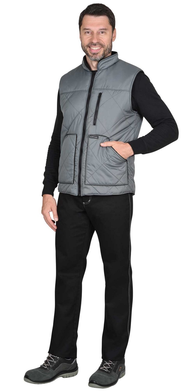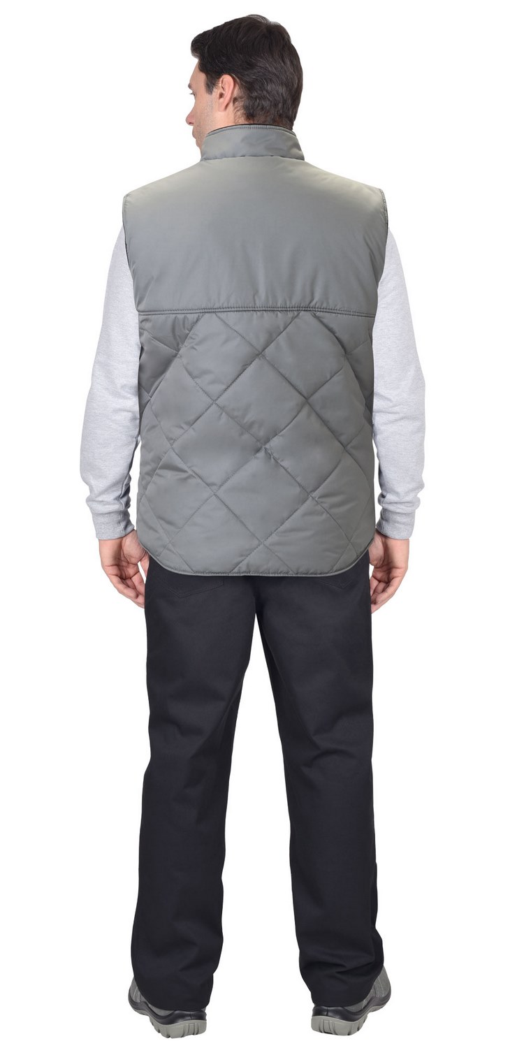 Жилет утеплённый, стёганный, прямого силуэта, на подкладке из флиса с центральной бортовой застёжкой на молнию, с воротником стойка, с нагрудным карманом с молнией и нижними фигурными утеплёнными карманами. Жилет с удлинённой спинкой. ГОСТ 25295-2003