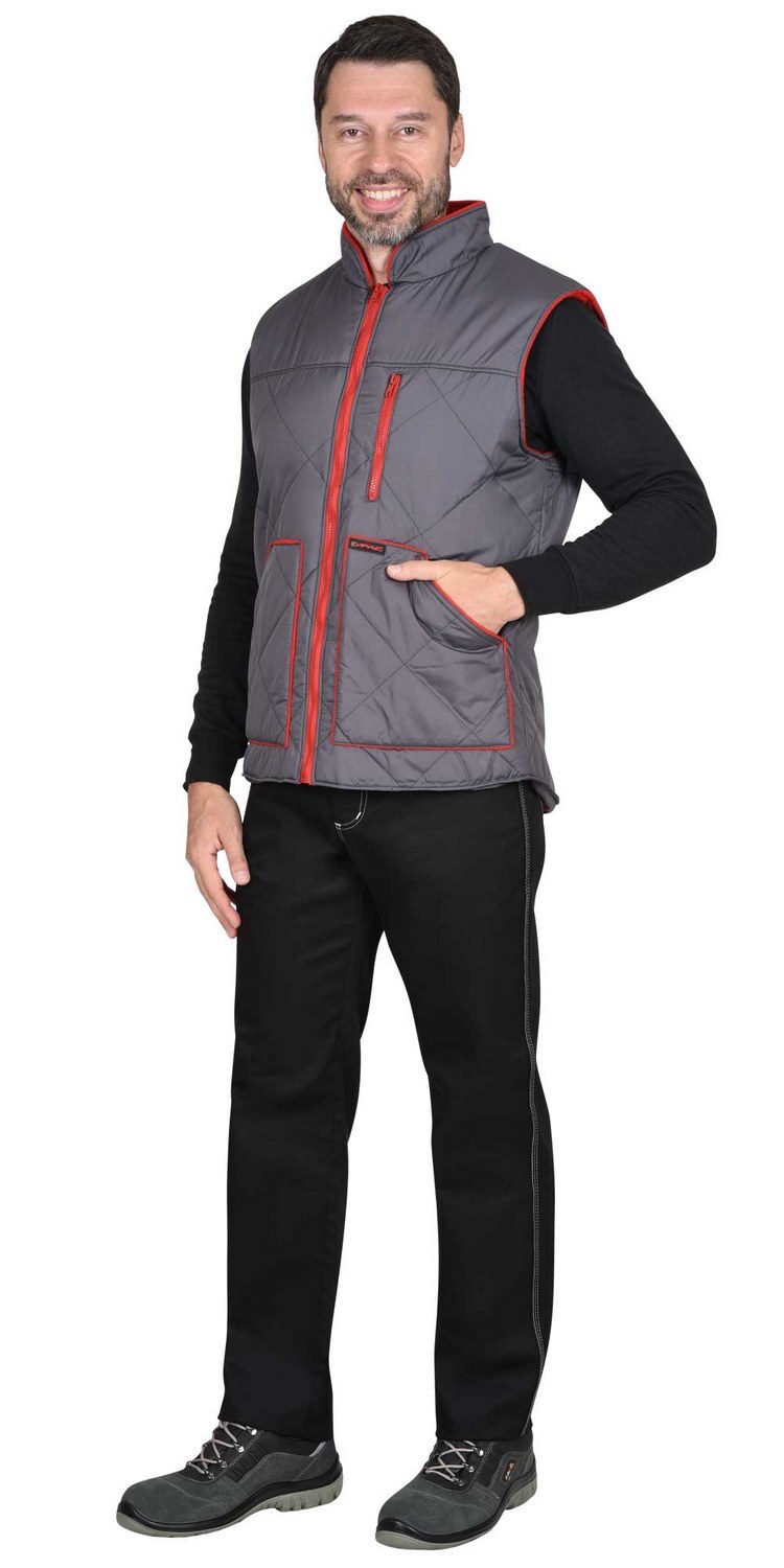Жилет утеплённый, стёганный, прямого силуэта, на подкладке из флиса с центральной бортовой застёжкой на молнию, с воротником стойка, с нагрудным карманом с молнией и нижними фигурными утеплёнными карманами. Жилет с удлинённой спинкой.
