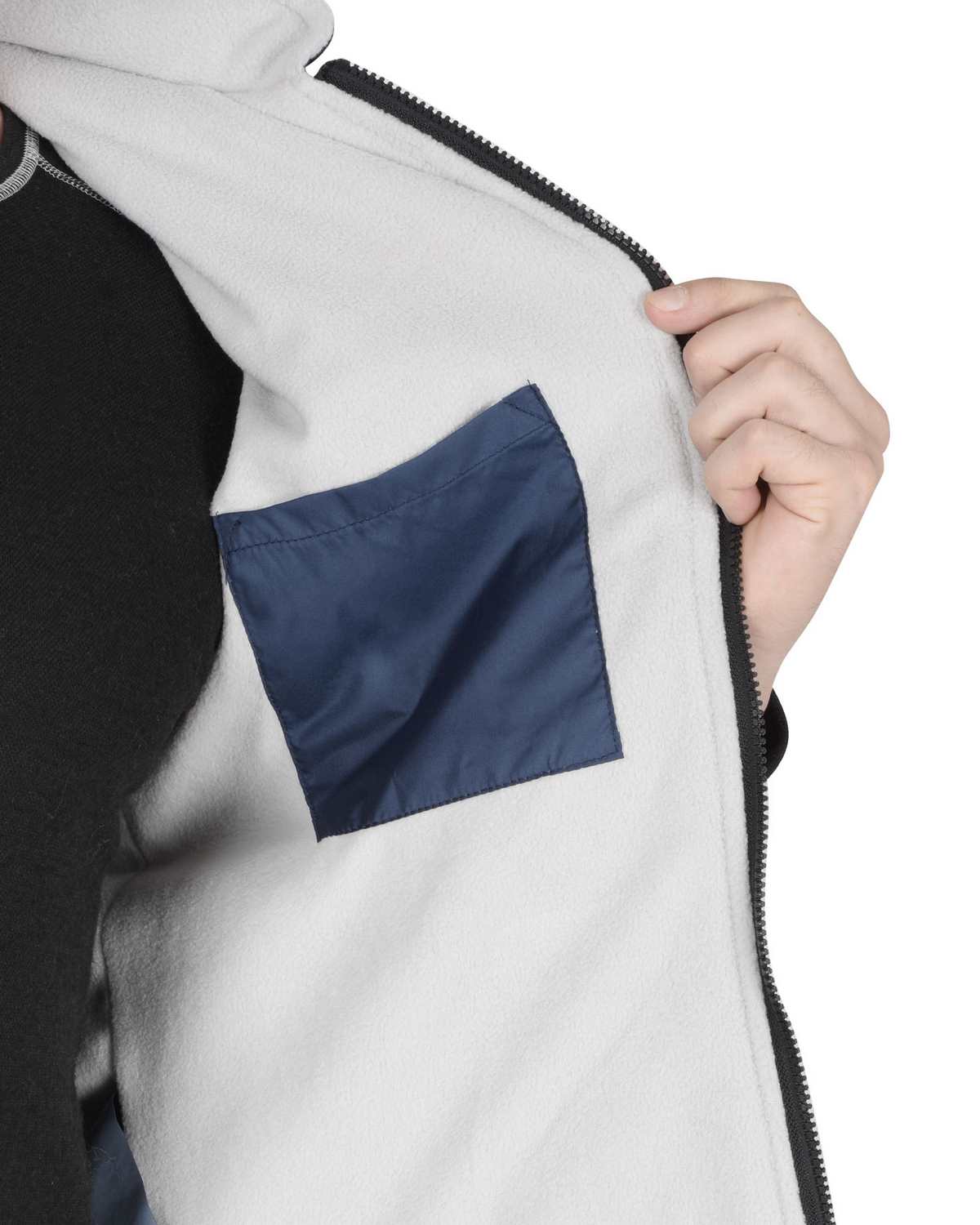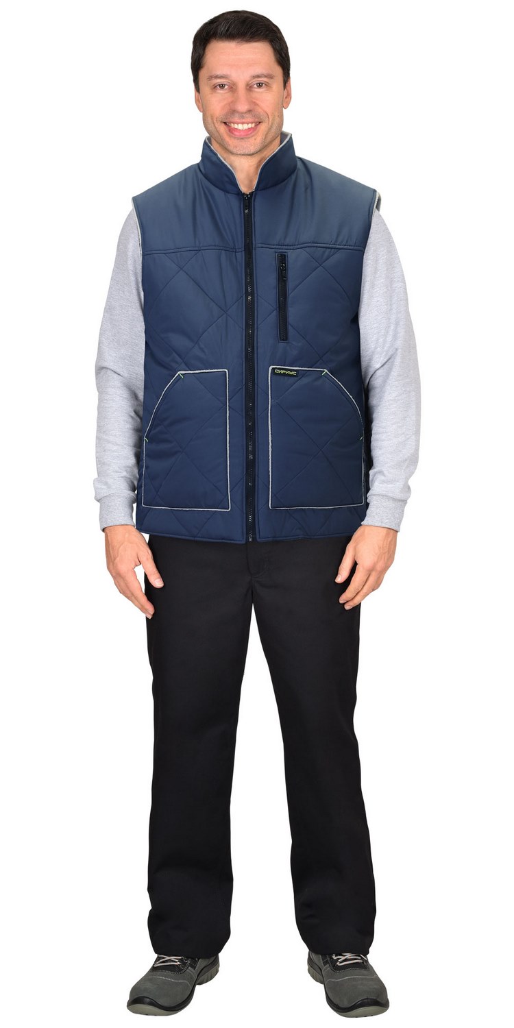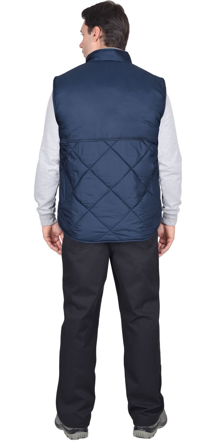 Жилет утеплённый, стёганный, прямого силуэта, на подкладке из флиса с центральной бортовой застёжкой на молнию, с воротником стойка, с нагрудным карманом с молнией и нижними фигурными утеплёнными карманами. Жилет с удлинённой спинкой.