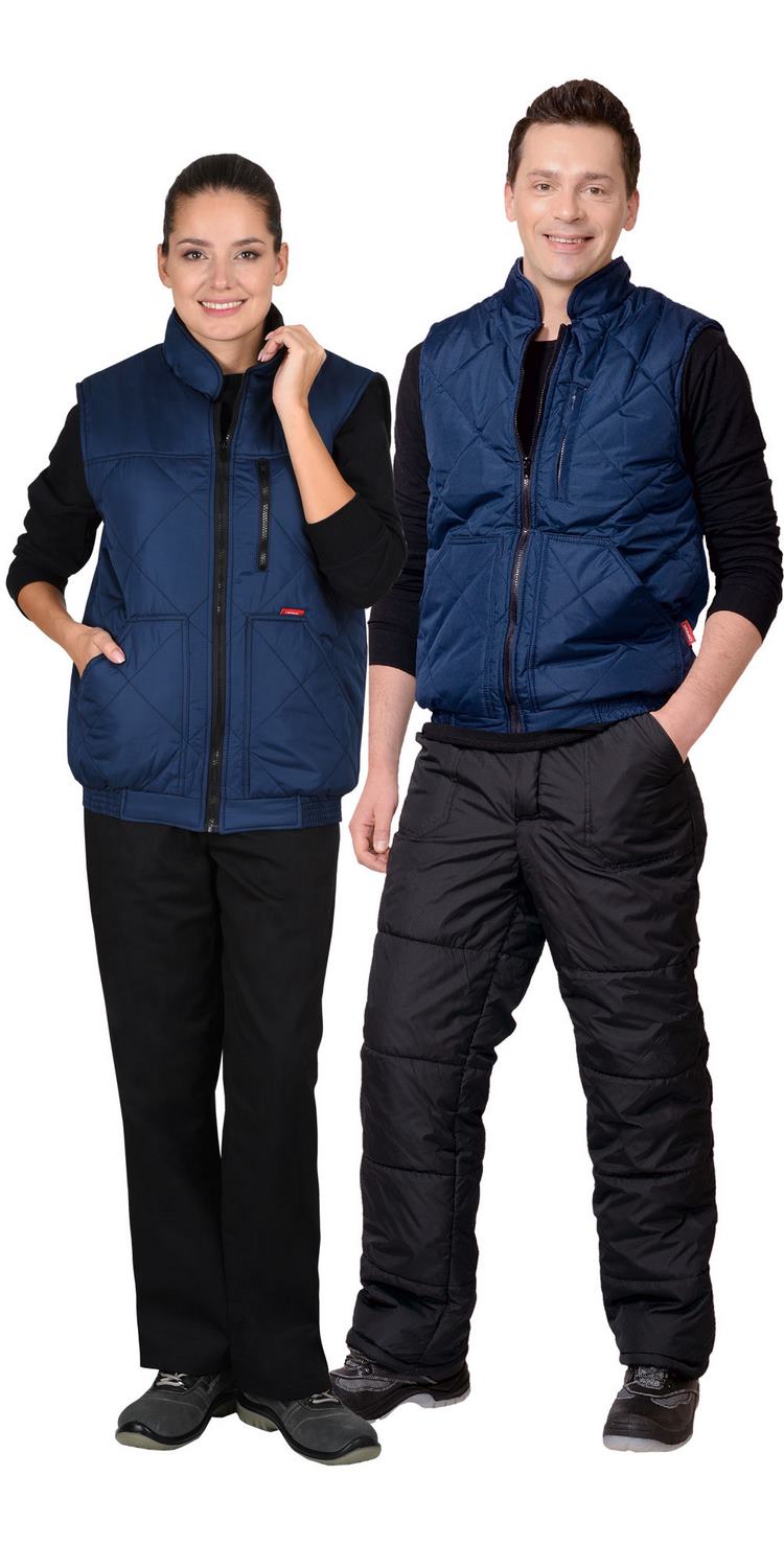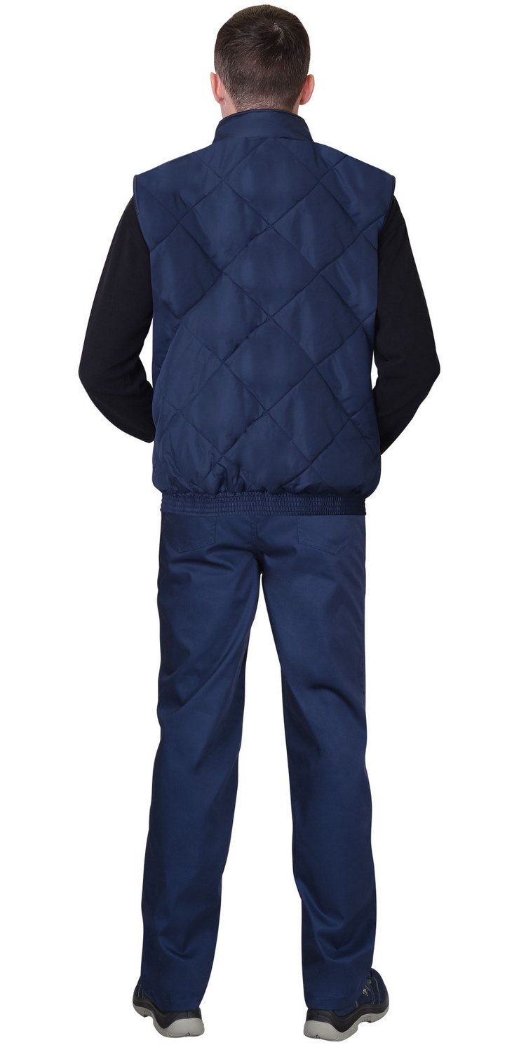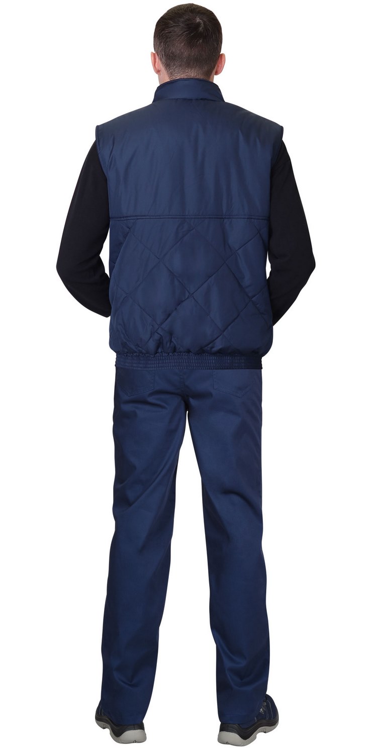 Жилет утеплённый, стёганный, на подкладке из флиса с центральной бортовой застёжкой на молнию, с воротником стойка, с нагрудным карманом с молнией и нижними фигурными утеплёнными карманами. Жилет на притачном поясе стянутом резинкой.