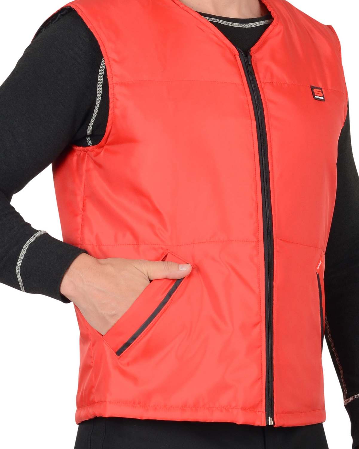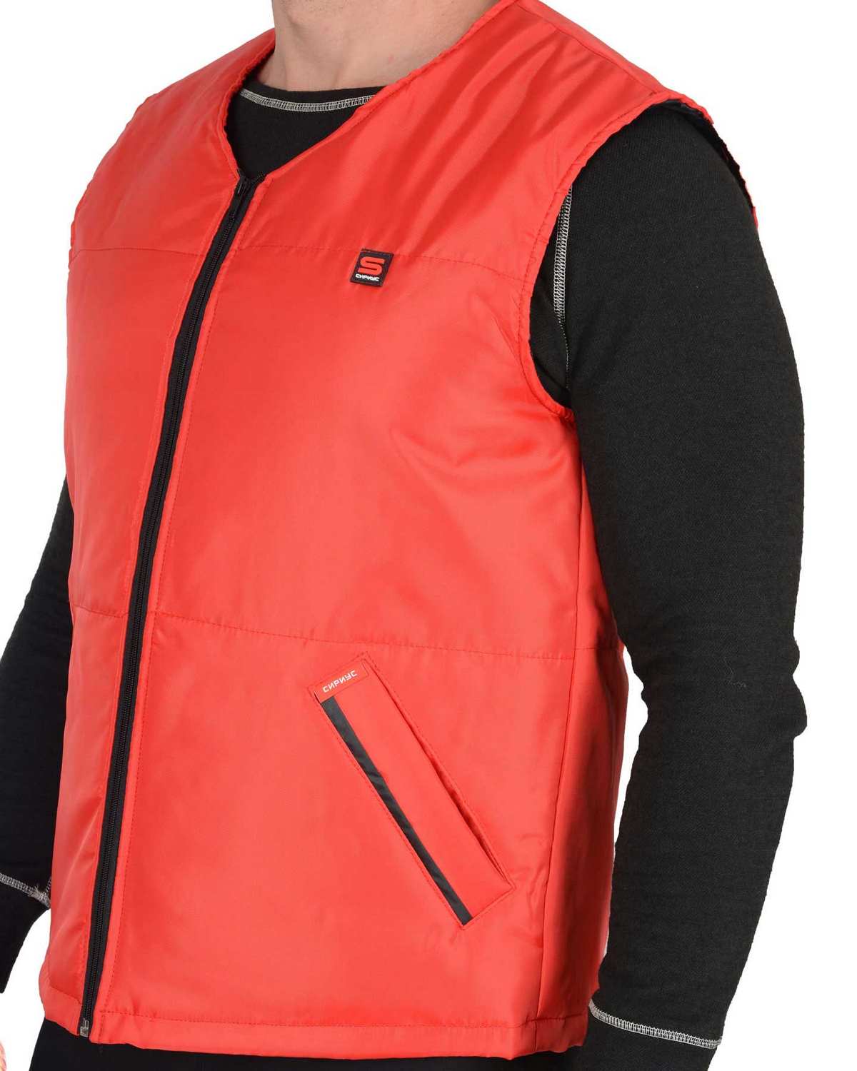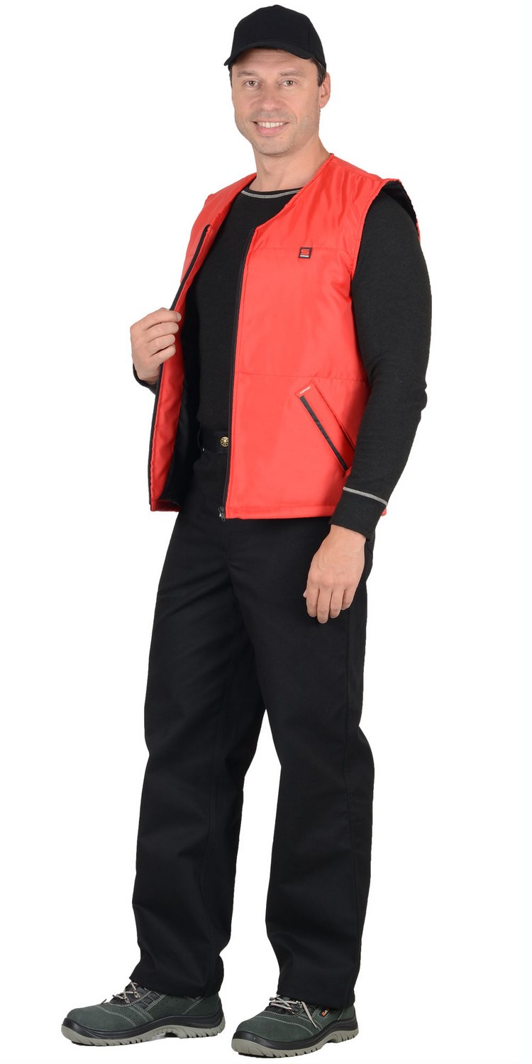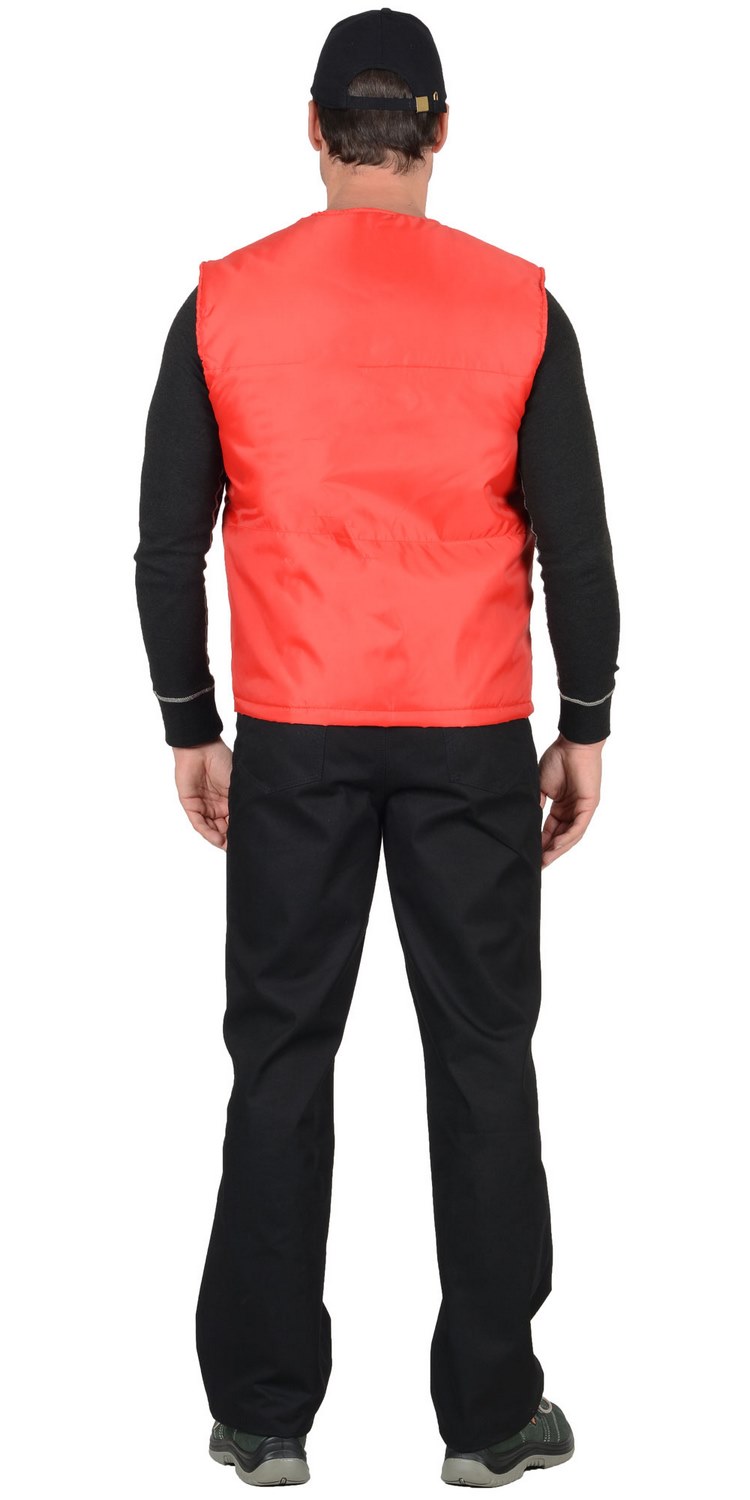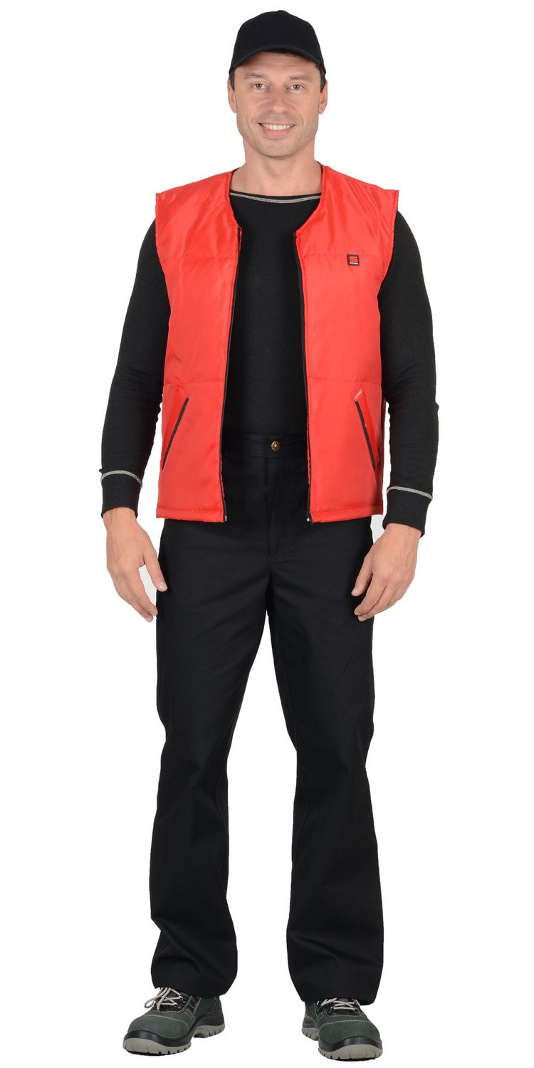 тк. Оксфорд-100%-п/э, утеплитель-синтепон. Жилет прямого силуэта, с притачной утепленной подкладкой, с центральной застежкой на тесьму - «молния», с V-образным вырезом горловины, с прорезными карманами с «листочкой» с втачными концами, с наклонным входом.